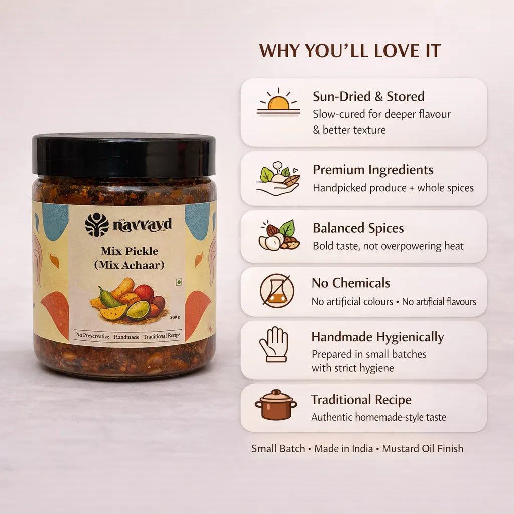 Why choose one when you can have it all? Our Mixed Achaar is a delicious blend of hand-cut vegetables and fruits like raw mango, carrot, lemon, green chillies, ginger, and more — all tossed in a bold mix of home-roasted Indian spices and aged in mustard oil.